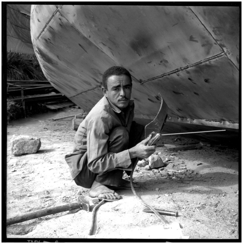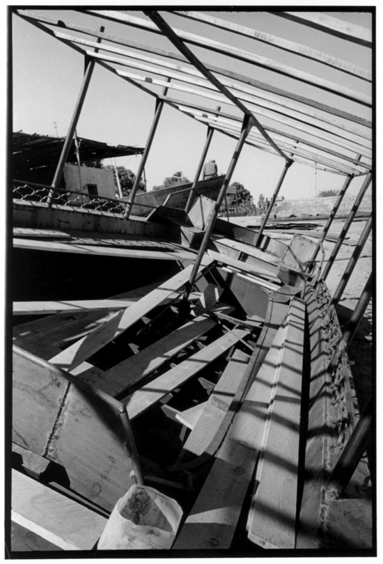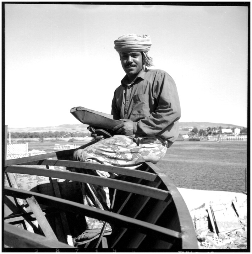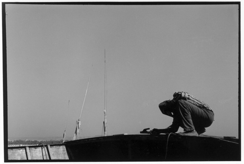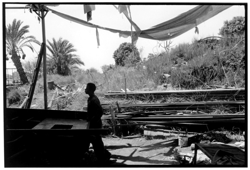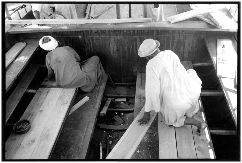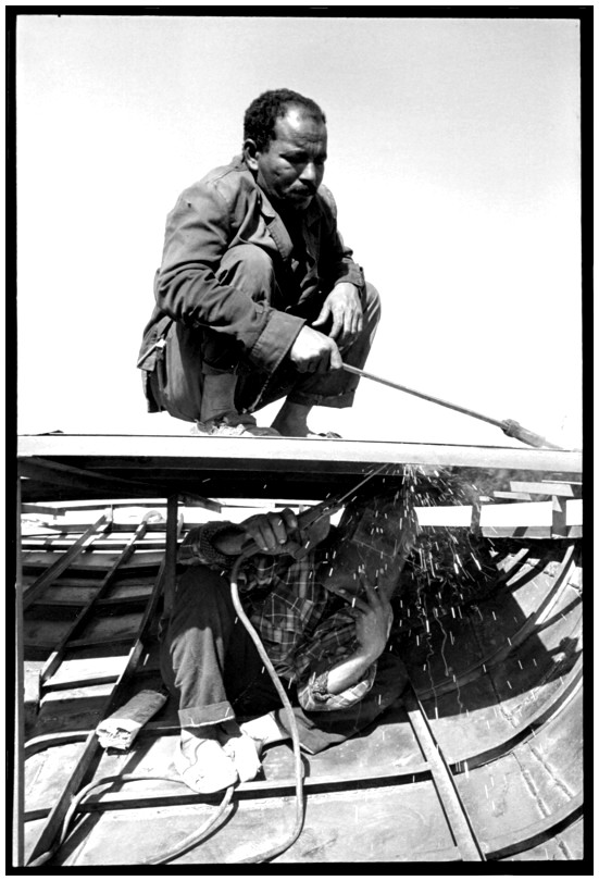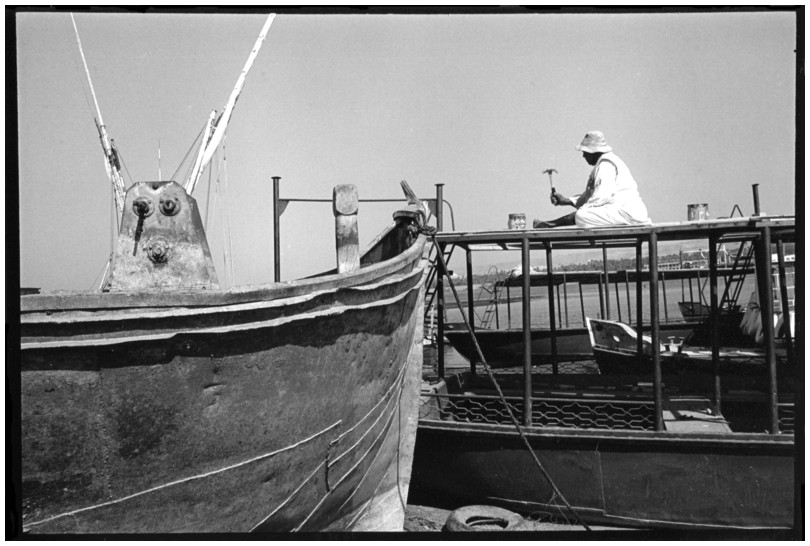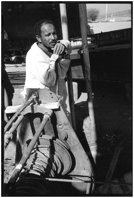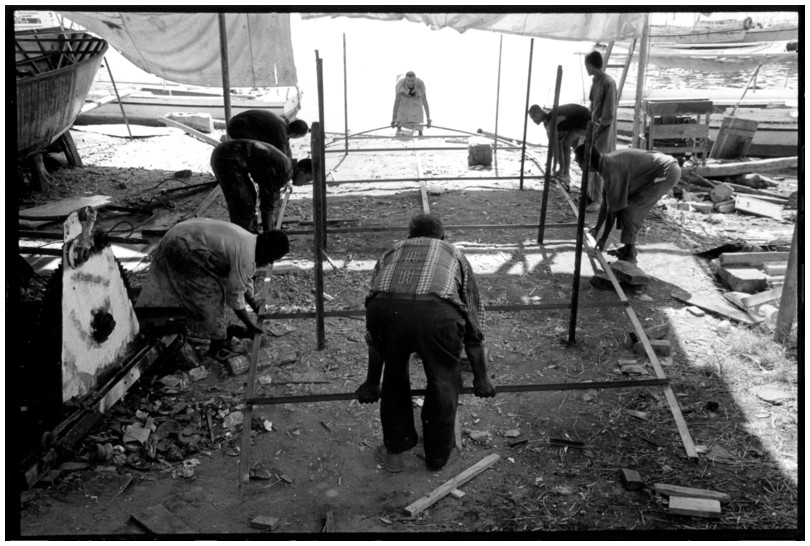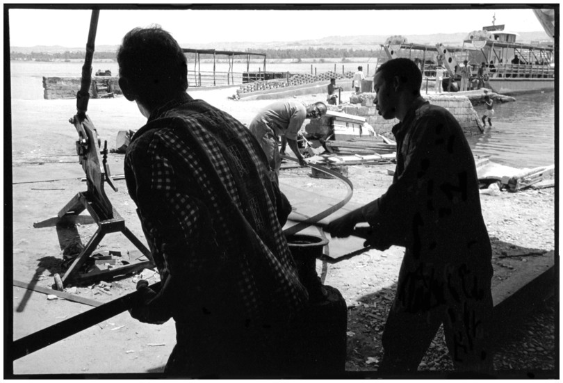 De nos jours, on y construit beaucoup plus de coques de bateaux à moteur que de felouques. De plus, la fabrication de coques en bois a quasiment disparu pour des raisons pratiques et économiques. Le bois est devenu rare et cher, même si le développement du téléphone portable a mis de nombreux poteaux télégraphiques sur le marché qui peuvent être utilisés pour le mât et les vergues. Par ailleurs, une coque en acier nécessite moins d'entretien qu'une coque en bois qui doit être repeinte au moins une fois par an. Une des conséquences de cette évolution est la disparition du savoir-faire des charpentiers de marine. Les coques métalliques sont fabriquées par assemblage soudé de nervures aux courbures formées à la masse et sur lesquelles sont soudées des plaques découpées et éventuellement formées à la masse également. L'outillage est minimal. Sur le terrain caillouteux qui descend en pente douce vers le Nil, on voit surtout des masses, des instruments de soudage à l'arc à électrode consommable, des serre-joints pour serrer les plaques à la structure lors du soudage, une grande cisaille pour découper profilés et tôles, une roue de camion servant d'enclume cylindrique posée sur une section de tronc d'arbre. Et puis, au moment de souder la plaque tenant lieu de tableau arrière pour la coque, Saad, le chef d'atelier, sort un niveau à bulle qu'on ne reverra pratiquement plus. Une fois terminées, les coques sont peintes, puis treuillées jusqu'au fleuve, une manoeuvre plus aisée en été qu'en hiver car l'eau est au plus haut en juillet et août et au plus bas en décembre. Les menuisiers viennent alors garnir de planches le fond de la coque et faire le toit. D'autres détails, enjoliveurs de de bastingage par exemple, sont aussi réalisés lorsque le bateau est à l'eau. Les photos proposées ici ont été prises principalement au chantier d'Assouan Ouest lors de plusieurs séjours depuis l'hiver 2001-2002 à l'hiver 2003-2004. Durant chaque séjour qui a duré d'une dizaine de jours à trois semaines, je suis venu au chantier au moins tous les deux jours pour y passer la journée et partager le temps avec ceux qui y travaillent. Le patron du chantier s'appelle Saïd. Il possède aussi les chantiers d'El Mansouria. Son frère et ses fils travaillent ici ou là. On y mange ensemble assis par terre, on y fait et boit le thé. Certains dorment sur place, couchés sur les banquettes et sous des couvertures. |