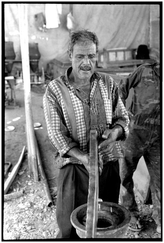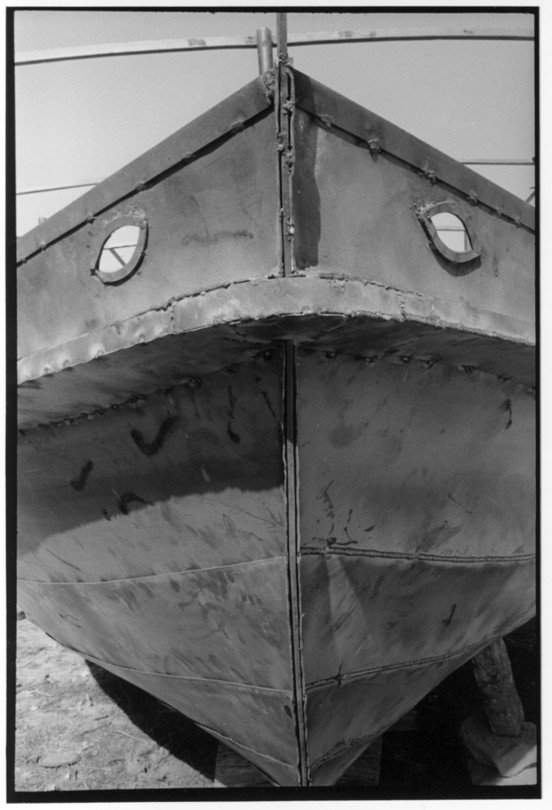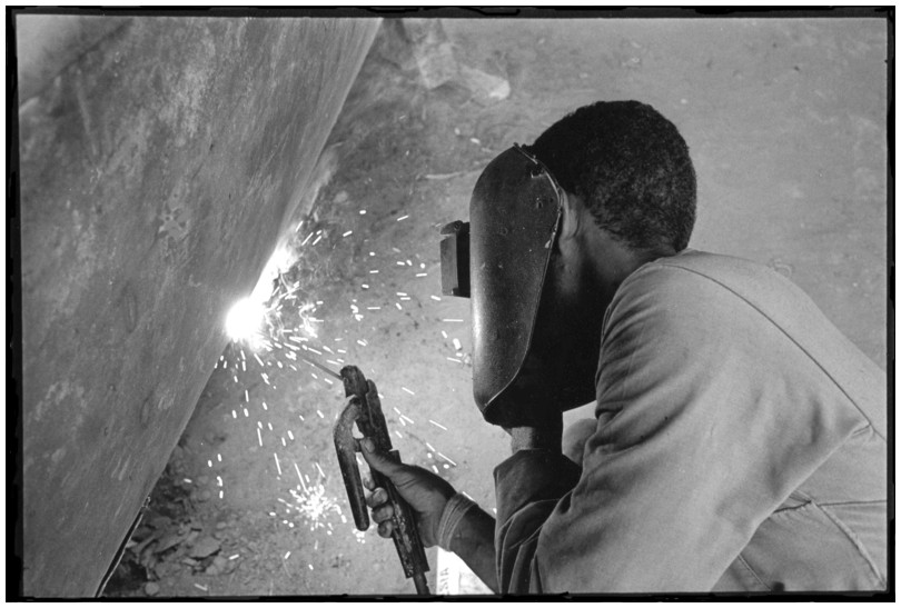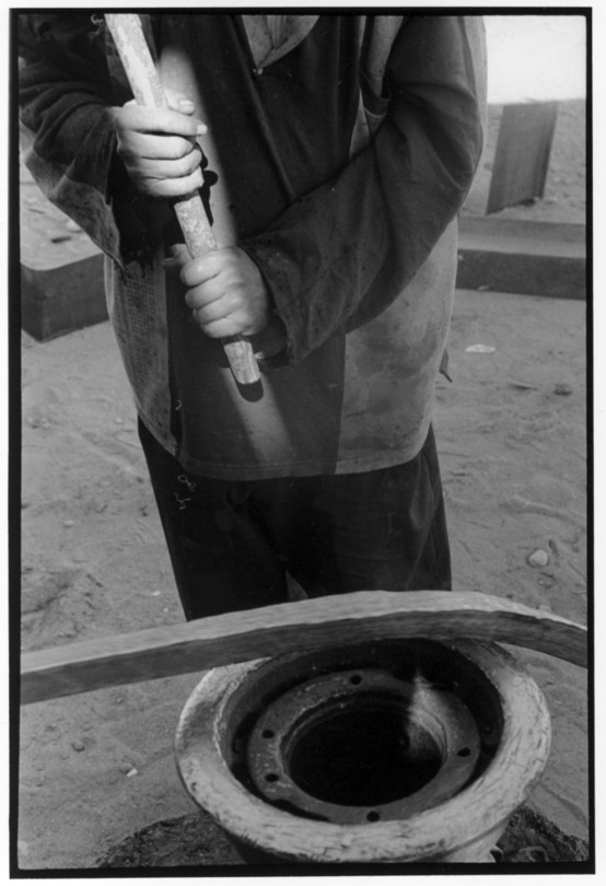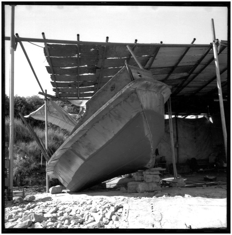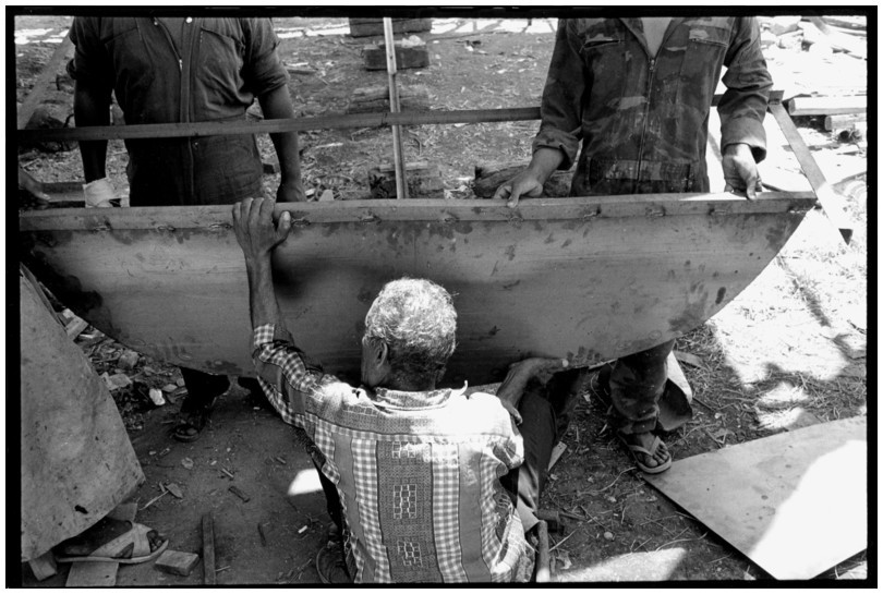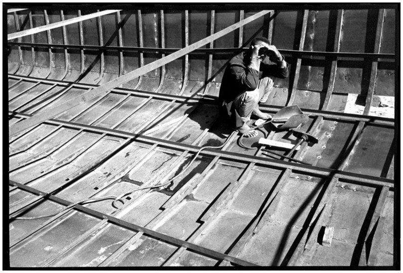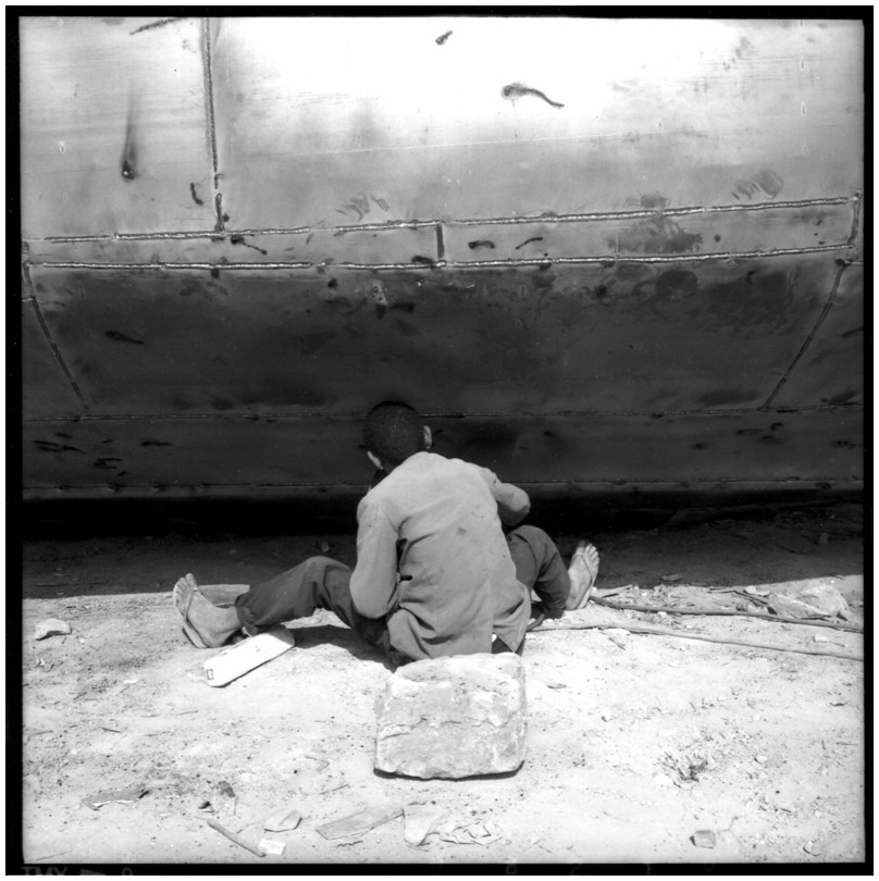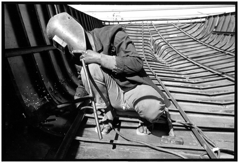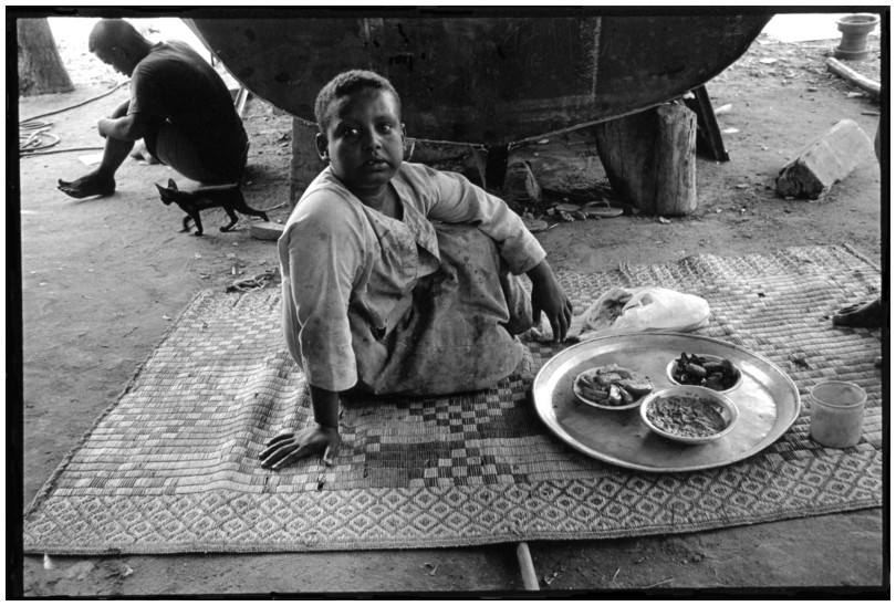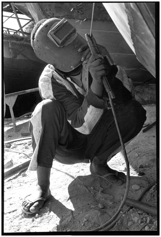 De nos jours, on y construit beaucoup plus de coques de bateaux à moteur que de felouques. De plus, la fabrication de coques en bois a quasiment disparu pour des raisons pratiques et économiques. Le bois est devenu rare et cher, même si le développement du téléphone portable a mis de nombreux poteaux télégraphiques sur le marché qui peuvent être utilisés pour le mât et les vergues. Par ailleurs, une coque en acier nécessite moins d'entretien qu'une coque en bois qui doit être repeinte au moins une fois par an. Une des conséquences de cette évolution est la disparition du savoir-faire des charpentiers de marine. Les coques métalliques sont fabriquées par assemblage soudé de nervures aux courbures formées à la masse et sur lesquelles sont soudées des plaques découpées et éventuellement formées à la masse également. L'outillage est minimal. Sur le terrain caillouteux qui descend en pente douce vers le Nil, on voit surtout des masses, des instruments de soudage à l'arc à électrode consommable, des serre-joints pour serrer les plaques à la structure lors du soudage, une grande cisaille pour découper profilés et tôles, une roue de camion servant d'enclume cylindrique posée sur une section de tronc d'arbre. Et puis, au moment de souder la plaque tenant lieu de tableau arrière pour la coque, Saad, le chef d'atelier, sort un niveau à bulle qu'on ne reverra pratiquement plus. Une fois terminées, les coques sont peintes, puis treuillées jusqu'au fleuve, une manoeuvre plus aisée en été qu'en hiver car l'eau est au plus haut en juillet et août et au plus bas en décembre. Les menuisiers viennent alors garnir de planches le fond de la coque et faire le toit. D'autres détails, enjoliveurs de de bastingage par exemple, sont aussi réalisés lorsque le bateau est à l'eau. Les photos proposées ici ont été prises principalement au chantier d'Assouan Ouest lors de plusieurs séjours depuis l'hiver 2001-2002 à l'hiver 2003-2004. Durant chaque séjour qui a duré d'une dizaine de jours à trois semaines, je suis venu au chantier au moins tous les deux jours pour y passer la journée et partager le temps avec ceux qui y travaillent. Le patron du chantier s'appelle Saïd. Il possède aussi les chantiers d'El Mansouria. Son frère et ses fils travaillent ici ou là. On y mange ensemble assis par terre, on y fait et boit le thé. Certains dorment sur place, couchés sur les banquettes et sous des couvertures. |