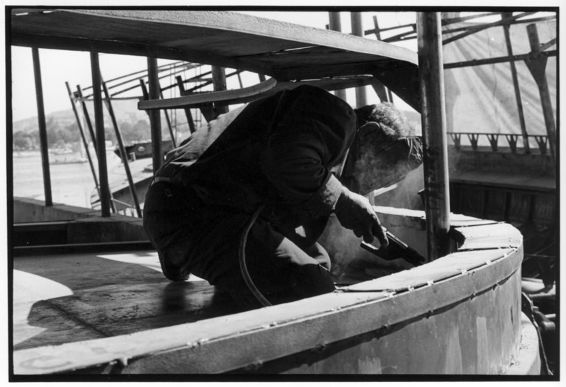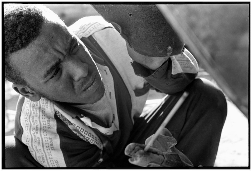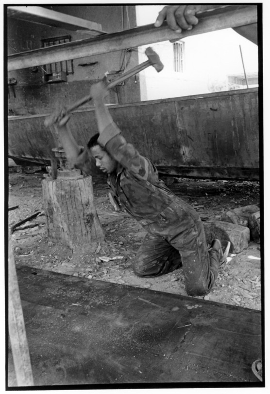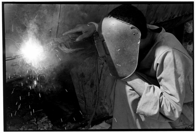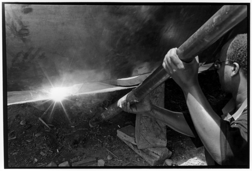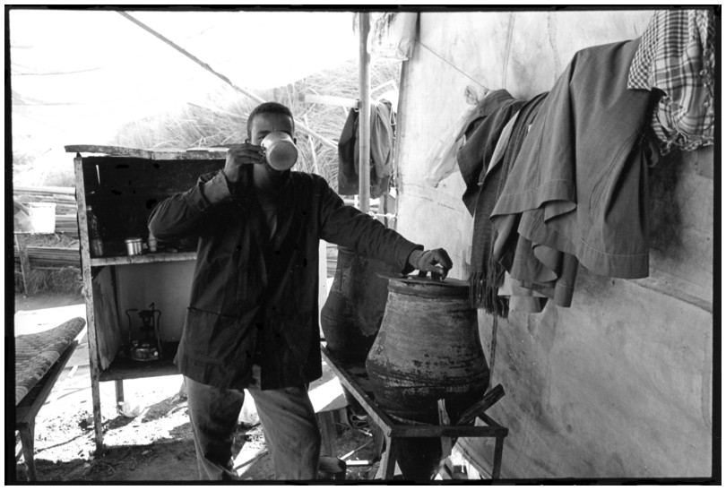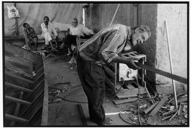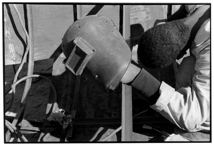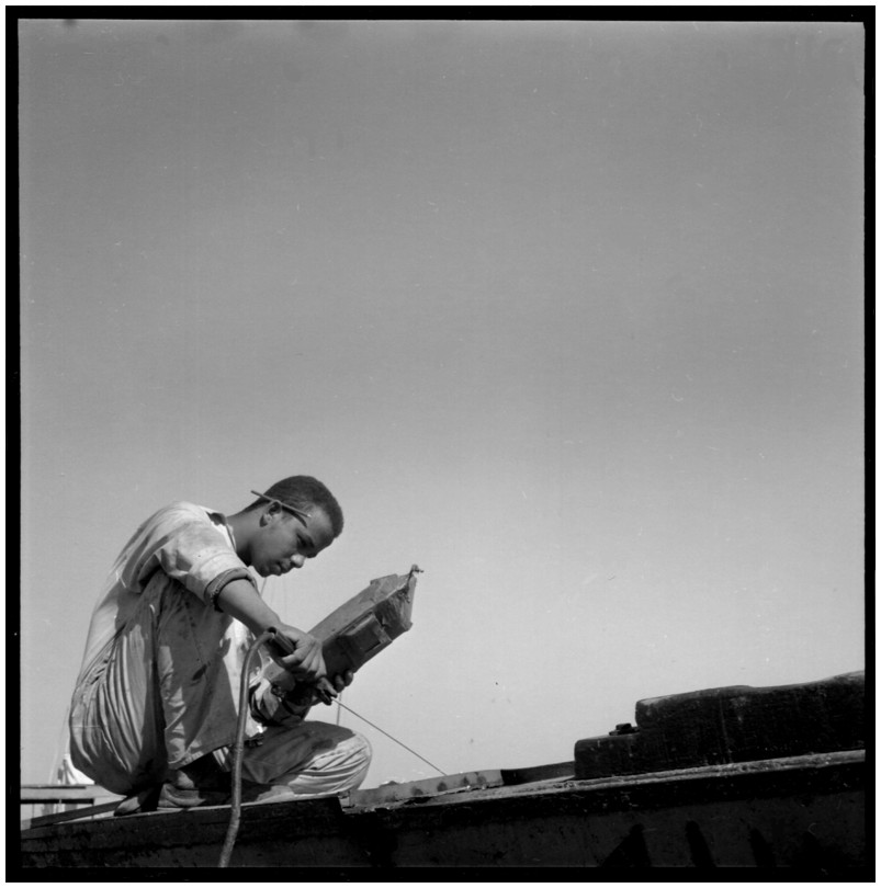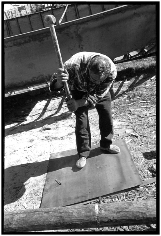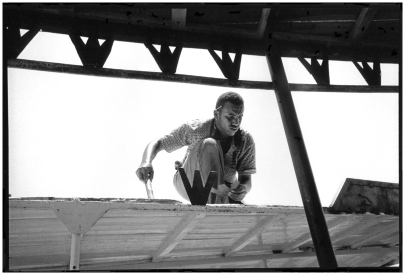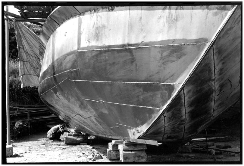 De nos jours, on y construit beaucoup plus de coques de bateaux à moteur que de felouques. De plus, la fabrication de coques en bois a quasiment disparu pour des raisons pratiques et économiques. Le bois est devenu rare et cher, même si le développement du téléphone portable a mis de nombreux poteaux télégraphiques sur le marché qui peuvent être utilisés pour le mât et les vergues. Par ailleurs, une coque en acier nécessite moins d'entretien qu'une coque en bois qui doit être repeinte au moins une fois par an. Une des conséquences de cette évolution est la disparition du savoir-faire des charpentiers de marine. Les coques métalliques sont fabriquées par assemblage soudé de nervures aux courbures formées à la masse et sur lesquelles sont soudées des plaques découpées et éventuellement formées à la masse également. L'outillage est minimal. Sur le terrain caillouteux qui descend en pente douce vers le Nil, on voit surtout des masses, des instruments de soudage à l'arc à électrode consommable, des serre-joints pour serrer les plaques à la structure lors du soudage, une grande cisaille pour découper profilés et tôles, une roue de camion servant d'enclume cylindrique posée sur une section de tronc d'arbre. Et puis, au moment de souder la plaque tenant lieu de tableau arrière pour la coque, Saad, le chef d'atelier, sort un niveau à bulle qu'on ne reverra pratiquement plus. Une fois terminées, les coques sont peintes, puis treuillées jusqu'au fleuve, une manoeuvre plus aisée en été qu'en hiver car l'eau est au plus haut en juillet et août et au plus bas en décembre. Les menuisiers viennent alors garnir de planches le fond de la coque et faire le toit. D'autres détails, enjoliveurs de de bastingage par exemple, sont aussi réalisés lorsque le bateau est à l'eau. Les photos proposées ici ont été prises principalement au chantier d'Assouan Ouest lors de plusieurs séjours depuis l'hiver 2001-2002 à l'hiver 2003-2004. Durant chaque séjour qui a duré d'une dizaine de jours à trois semaines, je suis venu au chantier au moins tous les deux jours pour y passer la journée et partager le temps avec ceux qui y travaillent. Le patron du chantier s'appelle Saïd. Il possède aussi les chantiers d'El Mansouria. Son frère et ses fils travaillent ici ou là. On y mange ensemble assis par terre, on y fait et boit le thé. Certains dorment sur place, couchés sur les banquettes et sous des couvertures. |